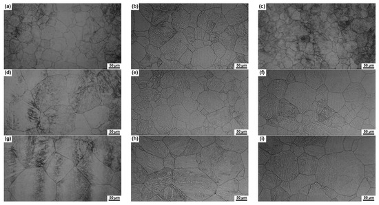 Grain morphology at different peak temperatures and t8/5 time: (a) 1200 °C, t8/5 = 20 s, (b) 1200 °C, t8/5 = 50 s, (c) 1200 °C, t8/5 = 100 s, (d) 1250 °C, t8/5 = 20 s, (e) 1250 °C, t8/5 = 50 s, (f) 1250 °C, t8/5 = 100 s, (g) 1300 °C, t8/5 = 20 s, (h) 1300 °C, t8/5 = 50 s, (i) 1300 °C, t8/5 = 100 s.