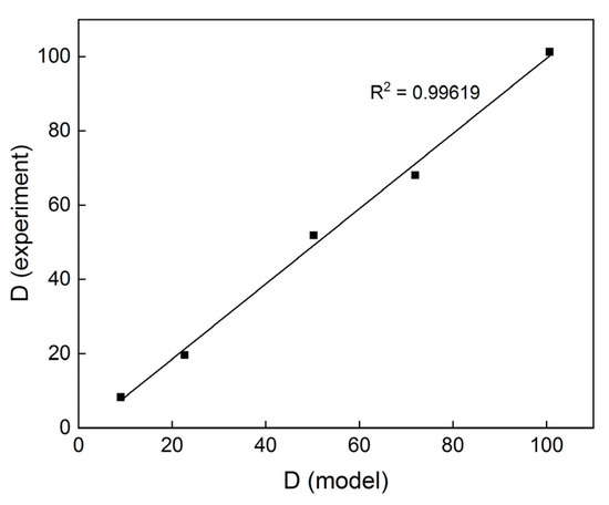 Figure 8 shows the correlation between the calculated grain size and the experimental value. Through linear fitting, the correlation between the two sets of data is above 0.99. It indicates that the grain prediction model can be applied, not only to the coarse grain heat-affected zone of SA508 Gr.4N steel, but also to the fine grain heat-affected zone. When the peak temperature continues to decrease (such as 900 °C and 800 °C), the experimental grain sizes were significantly smaller than those calculated by the model, and the model will no longer be applicable. The reason is that lower peak temperature and shorter holding time at the peak temperature will result in the undissolved precipitated phase (such as carbide) remaining. It is necessary to consider the nailing effect of grain boundary migration during the precipitation’s relative grain growth process [26,27].