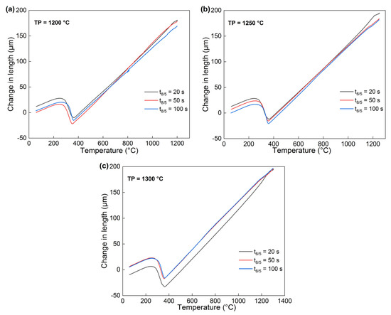 Cooling expansion curves at different peak temperatures and t8/5 time. (a) TP = 1200 °C expansion curve, (b) TP = 1250 °C expansion curve, (c) TP = 1200 °C expansion curve.