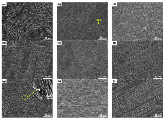 Microscopic structure at different peak temperatures and t8/5 time: (a) 1200 °C, t8/5 = 20 s, (b) 1200 °C, t8/5 = 50 s, (c) 1200 °C, t8/5 = 100 s, (d) 1250 °C, t8/5 = 20 s, (e) 1250 °C, t8/5 = 50 s, (f) 1250 °C, t8/5 = 100 s, (g) 1300 °C, t8/5 = 20 s, (h) 1300 °C, t8/5 = 50 s, (i) 1300 °C, t8/5 = 100 s.