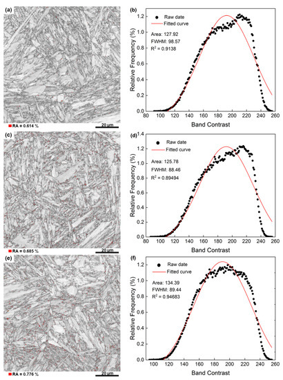 Phases distribution and BC values mixed with Gaussian fitted curves of samples under different treatments: (a,b) 1300 °C, t8/5 = 20 s; (c,d) 1250 °C, t8/5 = 20 s; (e,f) 1200 °C, t8/5 = 20 s.