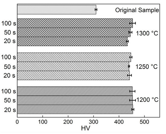 Figure 14 shows the Vickers hardness at different peak temperatures and t8/5 time. The original sample has an average hardness of 309.7 HV. According to Figure 1a, the original structure is the mixed structure of granular bainite and lath bainite, so the hardness value is relatively low. Combining the average value of Vickers hardness in Figure 14 and Table 3, it can be seen that the Vickers hardness values under different experimental conditions are within the martensitic hardness range, which is consistent with the characterized microstructure. When the peak temperatures were 1200 °C and 1250 °C, there was little difference in Vickers hardness at different t8/5 time. When the peak temperature was 1300 °C, the Vickers hardness increased about 10 HV with the increase in t8/5 time. From the grain size change of different t8/5 time at the peak temperature of 1300 °C, it can be inferred that the Vickers hardness increased with the refining of the grainsize. In general, the Vickers hardness is closely related to the microstructure of materials, but is less affected by grain size.