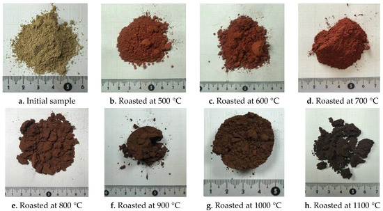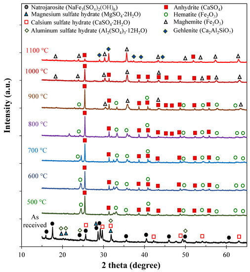 The appearance of the samples before and after roasting at 500–1100 °C for 4 h are provided in Figure 1. The color of the roasted samples changed from yellowish-brown on the initial sample to reddish-brown after roasting at 500–700 °C to dark brown after roasting at 800–1000 °C and further to black after roasting at 1100 °C. The color changes coincided with the minerals/phases change during the roasting, as shown in the XRD analysis results in Figure 2. The main phase of minerals in the initial sample was natrojarosite, calcium sulfate hydrate, aluminum sulfate hydrate, and magnesium sulfate hydrate. After being roasted at 500 to 800 °C, the anhydrite phase and hematite were revealed. At 900 to 1100 °C, the hematite transformed to maghemite. At 1100 °C, the anhydrite tended to disappear due to its dissociation into calcium oxide and sulfur dioxide, followed by reaction between calcium oxide, aluminum oxide, and silicon oxide forming Ca2Al2SiO7.