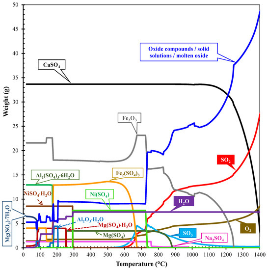 Nickel sulfate, magnesium sulfate, and calcium sulfate start dissociating into magnesium oxide, nickel oxide, and calcium oxide by releasing sulfur dioxide and oxygen at a temperature of 724, 800, and 1150 °C, respectively, following Equations (5)–(7).