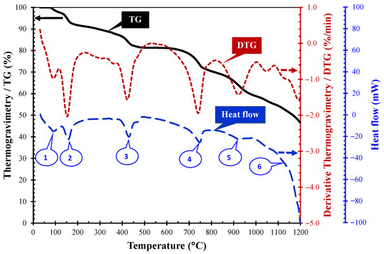 The TG/DTA measurement results of natrojarosite residue are shown in Figure 4. The natrojarosite residue decreased in weight during the heating from room temperature to 1200 °C. The phase changes estimated from the thermochemical simulation were taken into consideration in the interpretation of the TG/DTA measurement results. The weight loss due to the evaporation of water and dehydration in the natrojarosite residue can be seen in the temperature range of 90–150 °C (points 1 and 2 in Figure 4). Point 3 in Figure 4 seems to indicate the dissociation of natrojarosite following Equation 1, which takes place in the temperature range 390–450 °C. The dissociation of nickel sulfate and sodium sulfate appears to occur at 700–750 °C, as marked by point 4 in Figure 4. Point 5 in Figure 4 appears to be the dissociation of magnesium sulfate at 870–955 °C. Finally, the calcium sulfate starts to dissociate at 1000 °C (point 6 in Figure 4) which was confirmed by XRD measurements at 1100 °C, where the calcium sulfate pattern tended to disappear (see Figure 2).