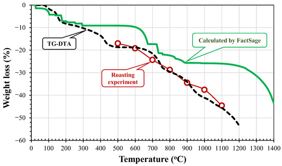 Weight losses versus temperature from roasting experiments, TG/DTA data, and thermochemical calculations by FactSage.