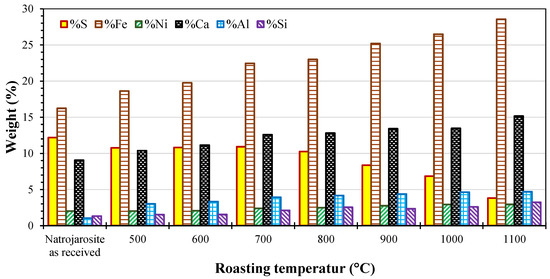 Changes in the chemical composition of the residue at different roasting temperatures were obtained from the XRF analysis, which was complemented with the estimated stable phases obtained from the XRD analysis and thermodynamic calculation. The data showed that the sulfur content decreased from 12.18% in the natrojarosite residue to 3.81% after roasting at 1100 °C as shown in Figure 6. Mombelli et al. [8] also reported that the sulfur content can be reduced from 8.86% in the jarosite to 2.55% in the jarosite after calcination at 1000 °C due to the release of sulfur in the form of SOx gas. Mombelli et al. [8] and Zhu et al. [11] suggested that the resulting SOx gas can be used for sulfuric acid production.
