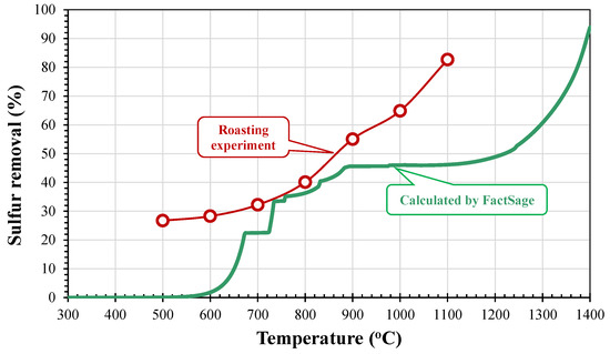 The sulfur removal efficiency calculated from the roasting experiment results compared with the thermochemical calculation is shown in Figure 7. Based on the roasting experiment, the sulfur removal had already occurred at 500 °C, while the thermochemical calculation indicated that sulfur removal begins to occur at 570 °C. As it has been stated earlier, this discrepancy was due to the overestimation of ferric sulfate and calcium sulfate dissociation temperatures in the thermochemical calculation. The roasting experiment data shows that the sulfur removal efficiency increased from 26% at 500 °C to 82% at 1100 °C.