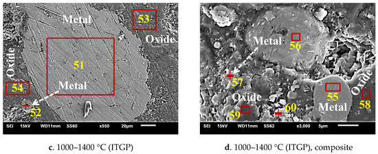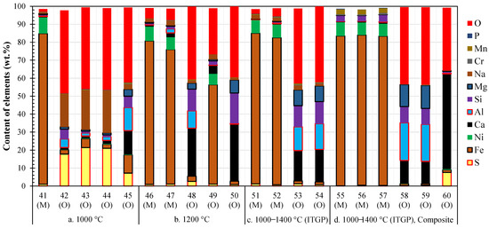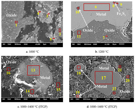 For reduced composite briquettes under ITGP, as shown in Figure 8d and Figure 9d, the trend was similar to the non-composite briquettes, as shown in Figure 8c and Figure 9c, in terms of the metallic iron formation. The sulfur, nickel, and silicon contents in the metal were 0.54%, 5.1%, and 14.6%, respectively. The iron content in the oxide phase was 1–19%. However, the sulfur content in the oxide phase of the reduced composite briquette was 17–24%, which was higher than in the non-composite briquette. This result was in line with the results of Zhang et al. [20], who used carbon to prevent the volatilization of sulfur in SOx gas. As the amount of carbon increased, the degree of sulfidation also increased [20,21]. The optimum temperature for the degree of sulfidation was 800 °C. As the roasting temperature increased, the sulfidation degree tended to decrease [20,21].