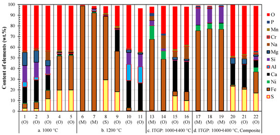 The isothermal-temperature gradient pattern (ITGP) from 1000–1400 °C was previously reported successful in separating metal in the form of nuggets or granules from limonite nickel ore [12] and iron sand concentrate (titanomagnetite) [13,14]. Unfortunately, no metal nugget or granule was produced in the case of natrojarosite residue. However, metallic iron was detected, as shown in area 13 in Figure 8c. Metallic iron contained 0.81% sulfur, 12.7% nickel, and 4.8% silicon. The final temperature of 1400 °C on the ITGP allowed the reduction of silicon oxide into silicon metal. The sulfur and iron content in the oxide phase were between 1–15% and 4–48%, respectively.