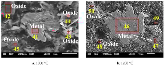 The natrojarosite residue that was roasted at 1100 °C for 4 h showed a decrease in sulfur content to 3.81% and an increase in iron content to 28.54%, as is shown in Figure 6. The results of the observations of the reduced briquettes of the roasted natrojarosite residue that were analyzed using SEM are presented in Figure 10, and the analysis of each point or each area by EDS is shown in Figure 11. For the briquette reduced at 1000 °C, the metallic iron was formed, as shown in area 41 in Figure 10a and Figure 11a, where the iron, sulfur, and nickel contents were 83.83%, 1.00%, and 9%, respectively. The sulfur content in the oxide phase was in the range of 7–22%. The phosphorous content in the metal phase was a maximum of 0.08%.