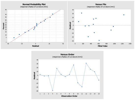 The values of R-sq = 99.61%, R-sq (pred) = 99.22%, and R-sq (adj) = 97.42% show that the employed model can accurately predict the behavior of the radius of curvature of laser-formed cylindrical surfaces. The residual plots for the applied model are shown in Figure 2, and it is concluded from Figure 2 that the applied model can predict the output parameter with acceptable accuracy.