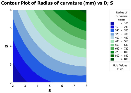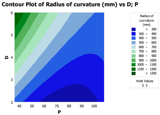 Next, the interaction between the input parameters and its effect on the radius of curvature of laser-formed cylindrical surfaces is investigated. In Figure 4, the interaction between laser power and distance between irradiation lines on the radius of curvature is shown. As can be seen from Figure 4, the radius of curvature of laser-formed cylindrical surfaces decreases as laser power increases and as the distance between irradiation lines decreases. The reason for this, as mentioned earlier, is that there is an increase in the amount of laser heat that is inputted to the sheet, which is followed by an increase in the areas of plastic deformation, and which ultimately leads to an increase in the deformation of the sheet and a decrease in its radius of curvature.