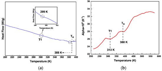 Figure 5 shows the phase transformation characterized by heat flow curve and expansion coefficient curve, respectively. It can be seen from Figure 5a that the alloy has a weak endothermic peak at temperature T1, about 300 K, as shown by the inset picture, indicating that there exists a first−order phase transformation around this temperature. In addition, the turn point of heat flow curve at 388 K indicates the occurrence of antiferromagnetic transition at temperature TN. The thermal expansion curve in Figure 5b confirms that the thermal expansion coefficient terraces at the two temperatures 313 K and 388 K correspondingly.