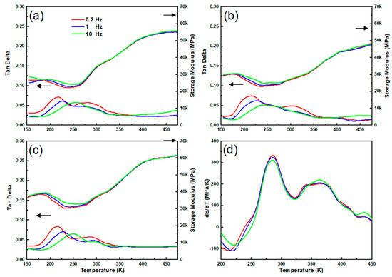Dynamic mechanical spectra of directionally solidified MnCuNiFe specimens under 3-point bending mode: (a) 1T, (b) 2T, and (c) 3T, where the arrows are pointed to two Y-axes of Tan Delta and Storage modulus, respectively, and (d) dE/dT of Figure 6a.