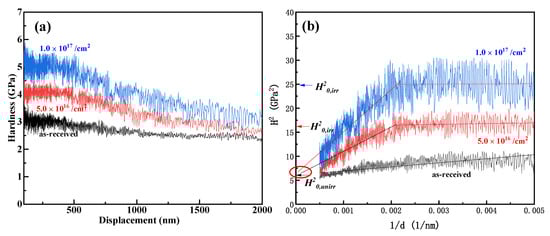 - Hosemann, P.; Kiener, D.; Wang, Y.; Maloy, S.A. Issues to consider using nano indentation on shallow ion beam irradiated materials. J. Nucl. Mater. 2012, 425, 136–139. [Google Scholar] [CrossRef]