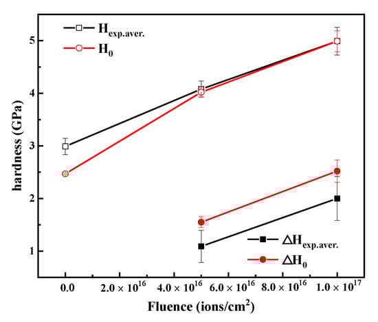 | Fluence (ion/cm2) | Hexpaver (GPa) | Hexpaver (GPa) | H0 (GPa) | H0 (GPa) | h* (nm) |