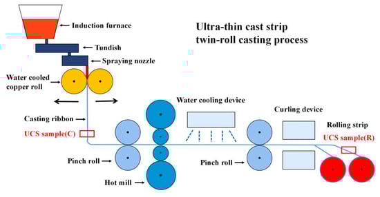 In recent years, twin-roll strip casting technology has been rapidly developed. The relatively mature technologies, including Nucor’s CASTRIP®, POSCO’s POSTRIP®, and EUROSTRIP® in Europe and BAOSTRIP® and E2STRIP in China, have also entered the stage of industrial implementation [1,2,3,4]. Shagang introduced CASTRIP® technology from Nucor steel company and built the first ultra-thin cast strip (UCS) production line with independent innovation in 2018. Compared to traditional hot continuous rolling and thin slab continuous casting lines, CASTRIP® technology is a novel forming technology by means of which thin strips can be directly produced from molten melt with less energy consumption, low investment, and small occupation [2,5]. The development of CASTRIP® technology aims to simplify the steel production flow by minimizing the size of the casting machine and simplifying the requirements for the hot reduction of steel strip [6].