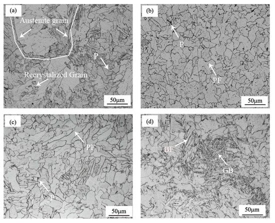 The microstructure of the samples varied with the different procedures, as shown in Figure 2. The microstructure of the UCS Q235BRE(C) sample was shown in Figure 2a. It could be seen that fine recrystallized grains were formed, and the prior austenite grain size was more than 150 µm, which was relatively coarse, compared with the fine austenite grain size produced during conventional hot rolled strip rolling. The coarse austenite grain size retarded the austenite transformation process, compared with conventional fine grained hot rolled strip steels [15]. Regardless of the addition of RE, the samples of UCS Q235BRE(R) and UCS Q235B(R) had a similar microstructure, both consisting of polygonal ferrite (PF) and a small amount of pearlite (P), as shown in Figure 2b,c. The volume fractions of the polygonal ferrite in these two samples were both 98%. The difference was that the grain size after RE alloying was significantly refined from 41μm in the sample of Q235B(R) to 24 μm in the sample of Q235BRE(R). Figure 2d shows the microstructure of the UCS SPA-H(R) samples, which consisted of 57% polygonal ferrite, 32% granular bainite (GB), and 11% bainitic ferrite (BF). The volume fraction of each constituent of the samples was estimated by using the analysis software Image-Pro and named according to the ISIJ transformation products nomenclature. The volume fractions of the different steels are shown in Table 2.