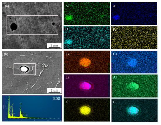 In order to determine the inclusion types, SEM observation and EDS mapping analysis of inclusions were conducted, as shown in Figure 3. The designation of chemical elements demonstrated the enrichment of the elements in the inclusions. It was found that the inclusion in UCS Q235B (R) steel was enriched with Si, Al, and O (Figure 3a). Ce, La, S, O, Ca, and Al are concentrated in the inclusion in UCS Q235BRE (R) steel in Figure 3b.