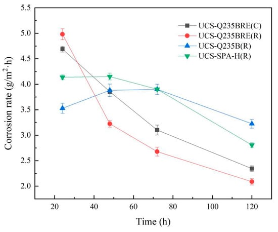 where G0 is initial sample weight (g), G1 is sample weight after immersion test (g), S the area of exposure (m2), and T the time of exposure (h). The results of weight loss measurements are given in Table 4. After immersion, the weight loss of the steels was ranked in the following order: UCS-Q235B(R) steel > UCS-SPA-H(R) steel > UCS-Q235BRE(C) steel > UCS-Q235BRE(RE) steel. Figure 4 shows the relationship between corrosion rate as a function of time obtained by wet–dry immersion tests.