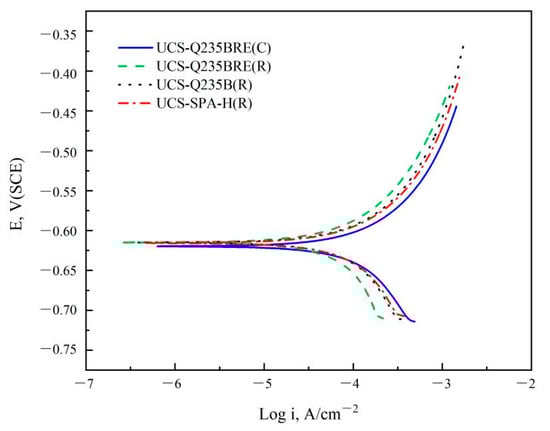 The corrosion process of steel was essentially an electrochemical process. Improving the uniformity of microstructure was equivalent to reducing the potential difference between the anode and cathode of corrosion cell, which led to the reduction of corrosion rate, especially slowing down the trend of local corrosion [26,27]. It can be seen from the metallographic photograph in Figure 2 that the microstructure of UCS-Q235BRE(R) steel was a uniform single PF with a small amount of P. There were no obvious potential differences between phases. The grain refinement caused by RE resulted in the dilution of segregated alloying elements at GBs, thus alleviating the intergranular corrosion, which was responsible for the improvement of the corrosion behavior. UCS-SPA-H(R) steel was a composite structure of PF, GB, and BF. The potential difference between phases was relatively high, although several weathering-resistant elements, such as Cu, P, Cr, and Ni, were added into UCS-SPA-H(R) steel. The improvement of corrosion resistance by alloying elements was mainly reflected in the following three aspects, including reducing the conductive property of the rust layer and changing the type and structure of the corrosion products, accelerating the uniform dissolution of matrix and conversion from Fe2+ to Fe3+ and blocking the cracks in rust layer. Under the special process of CASTRIP®, the element alloying led to a multi-structure, which negated the effect of weathering-resistant elements on the corrosion performance [28]. In other words, the uniform structure contributed more to corrosion resistance, compared to certain alloying elements.