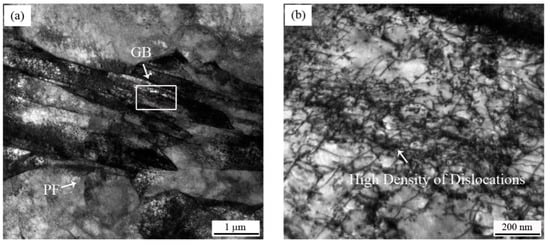 (a) Morphology of PF and GB in UCS-Q235BRE(R) steel; (b) high magnification of dislocations in GB, framed by a white box.