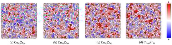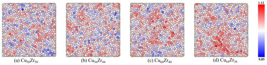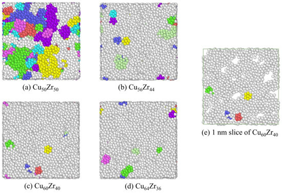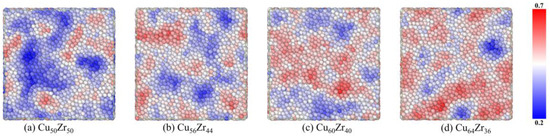- Using the developed MRO identification procedure, it was found that an increase in Cu content leads to an increase in full icosahedral clusters and a tendency to interconnect to form large bone regions, thus reducing the density of MRO defects. It implies that lower MRO defects may also be an important reason for the higher glass forming ability and more stable kinetic properties of Cu64Zr36 MGs.