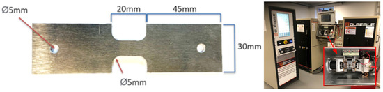 Sample geometry used for Gleeble thermomechanical processing, and Gleeble 3800 test machine (Gleeble, Poestenkill, NY, USA).
