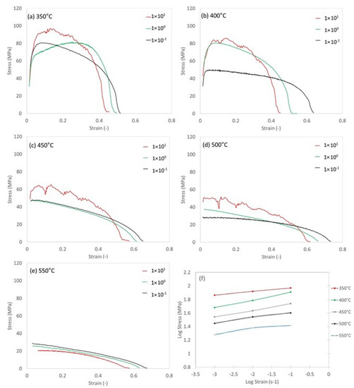 Stress vs. strain at (a) 350 °C, (b) 400 °C, (c) 450 °C, (d) 500 °C, and (e) 550 °C, (f) ‘m’ values of material across all temperatures at 0.1 strain.