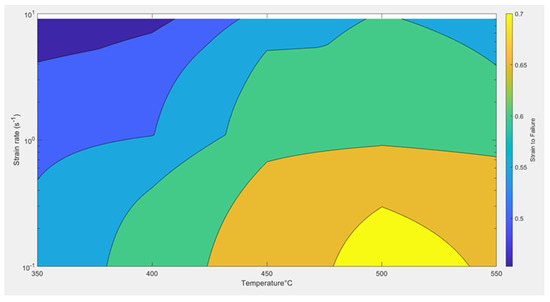To better illustrate the behaviour of the material across all conditions, forming processing maps illustrating strain to failure and peak stress are shown in Figure 4. Strain to failure increases due to the increased energy available at higher temperatures, which allows extra deformation mechanisms to become active within the microstructure. Figure 4 then better illustrates the reduction in peak strain at 550 °C compared to 500 °C due to excessive material softening. Similar reductions in strain to failure have been reported at lower temperatures in AA6082, indicating AA6010’s ability to be formed at higher temperatures [23].