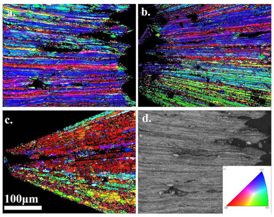 EBSD maps from the failure region of samples deformed at 1 × 10−1 s−1 strain rate and three temperatures (350 °C, 400 °C and 500 °C) are shown in Figure 5a–c, respectively. Tearing failures can be observed within the 350 °C and 400 °C specimens with far more deformation and localised necking observed in the 500 °C specimen. With all specimens, tearing and void coalescence is evident in the presence of secondary particles which is more clearly shown in the band contrast image in Figure 5d where a clear tear in the bulk material is obvious as the grains have moved past the intermetallic.