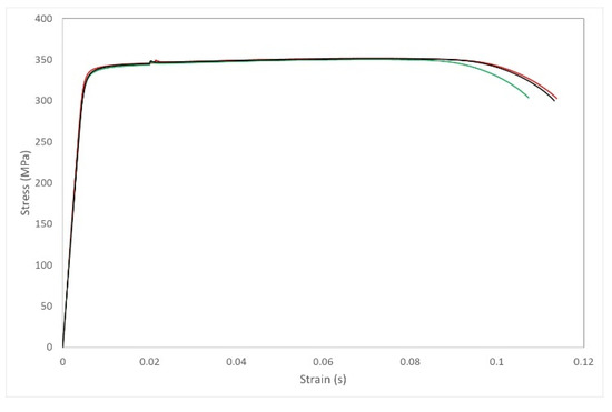 Hot tensile testing was carried out in a Gleeble 3800 in a similar methodology to previous studies on 2000- and 6000-series alloys [22,23]. K-type thermocouples were attached to the gauge length of the sample and a preload of 0.1 kN was applied to the sample. A typical thermal profile can be seen in Figure 2. The sample was heated to 565 °C at a rate of 7 °C/s where it was held for 5 min for solutionising; subsequently, the sample was cooled to the deformation temperature at 10 °C/s and held for 10 s, and then deformed to failure before being quenched to room temperature. A matrix of deformation temperatures and strain rates was used, comprising deformation temperatures every 50 °C between 350 and 550 °C, at strain rates of 0.1, 1 and 10 s−1 with 3 repeats for each condition. Test parameters were selected to investigate the most industrially relevant conditions under which this material would potentially be formed.