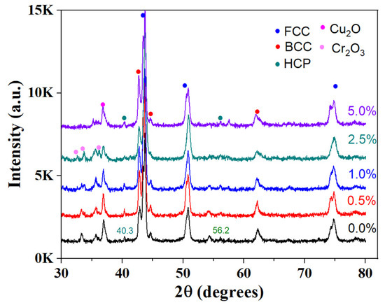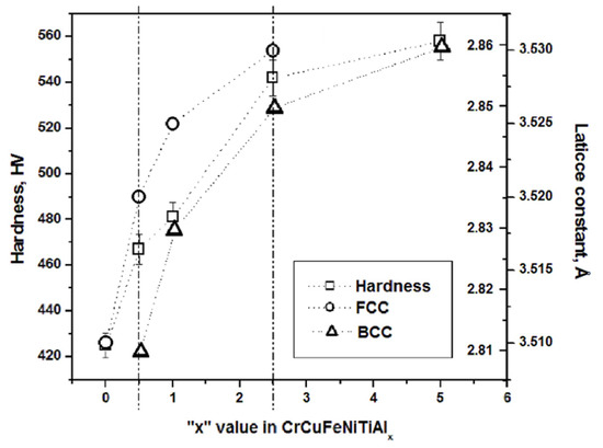 In Figure 2, a considerable increment in lattice constants of both structures (FCC and BCC) is observed as the proportion of aluminum increases. However, the increase of the lattice constant is more significant for aluminum contents between 0.5% and 2.5% in the alloy. Its increase is associated with the atomic radius of Al and its solid solubility into the FCC and BCC phases present in the CrCuFeNiTiAlx system. As previously discussed, the presence of aluminum plays an essential role in the random formation of a solid solution composed of several metals presenting a mixture of FCC and BCC structures.