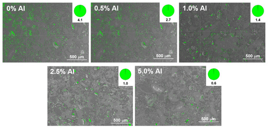 The general microstructure of sintered HEAs is depicted in Figure 3. It is composed of irregular grains of varied sizes and particle shapes. Samples exhibited a wide distribution of particle sizes, with a multimodal behavior ranging from 0.5 to 50 microns. Their microstructure is composed of larger grains with different contrast (brighter zones) and various morphological features. These bright grains with different aluminum concentrations are associated with other metallic compounds formed during the alloy-processing, as detected by XRD and SEM-EDS. Micrographs at low magnification (100x) were processed using an image processor (AxioVision SE64) and porosity was calculated as an image percentage (the values are illustrated by green circle inserts and the results are shown below the circle of each micrograph of Figure 2). When intermediate amounts of Al are added in the HEA, there is an evident reduction in porosity; thus, a higher densification is obtained.
