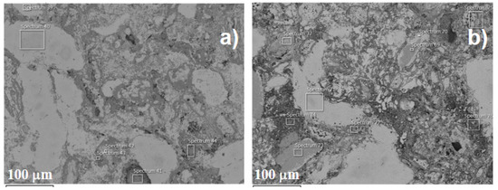 Through the observations and analyses with scanning electron microscopy (SEM) and energy dispersive X-ray spectroscopy (EDS), it was evident that sintered CrCuFeNiTiAlx alloys possess a multi-phase microstructure (Figure 4). Figure 4a shows the microstructure corresponding to the CrCuFeNiTi sample, where different morphology zones were observed. Spots enclosed in a white box indicate the specific area where the chemical analyses were carried out. Figure 4b corresponds to the CrCuFeNiTiAl0.05 sample.