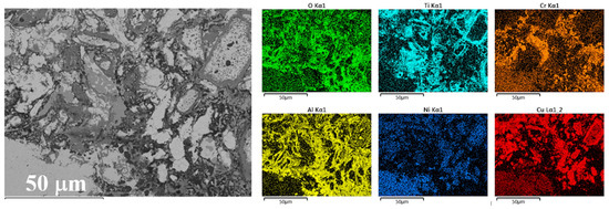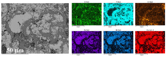 According to the above results, it may be said that oxidation occurs during the solid-state processing (as detected by XRD), and the microstructure of the CrCuFeNiTi alloy synthesized by powder metallurgy is composed of two main phases. In comparison, the CrCuFeNiTiAl0.05 alloy is composed of three main phases. Elemental mappings were obtained to analyze each sample’s elemental distribution. Figure 6 shows an SEM micrograph and the CrCuFeNiTi alloy’s elemental mapping separated by element distribution. From these results, it can be inferred that the microstructure of this alloy is composed of a high Cu, Fe and Ni solid solution (light region), a dark region composed of Ti and Cr, and a dispersed chromium oxide phase.