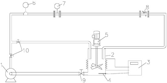 Schematic diagram of the erosion-corrosion testing rig (1—slurry pump, 2—slurry tank, 3—cryostat circulator, 4—thermocouple, 5—stirrer, 6—pressure gage, 7—electromagnetic flowmeter, 8—pipe flow testing section, 9—ball valve, 10—stop valve).