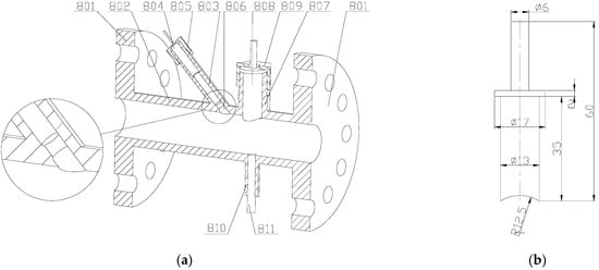 Schematic diagram of ((a): 801—flange, 802—acrylic tube, 803—reference electrode installing pipe, 804—reference electrode, 805—nut of the reference electrode, 806—porous material, 807—working electrode installing pipe, 808—working electrode, 809—nut of the working electrode, 810—auxiliary electrode installing pipe, 811—auxiliary electrode) the pipe-flow testing section and (b) the working electrode (mm).