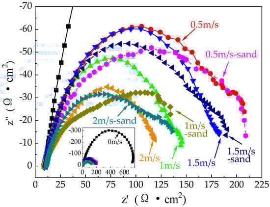 This work focused on the erosion-corrosion problem in straight gathering liquid pipes. Flow velocities and sand concentrations were selected accordingly. For a straight pipe, an economical velocity of 1 m/s was suggested [25]. However, a relatively large flow velocity of 2 m/s was also seen in the field [26]. As a result, the flow velocity was controlled to be no larger than 2 m/s. For the oilfield brine without sand, EIS tests were performed for five flow velocities: 0, 0.5, 1, 1.5 and 2 m/s. Sand concentrations in the flow vary with different oil reservoirs, a sand concentration range of 0.5~2 wt% was selected by referring to the literature [27]. Noting that under-deposit corrosion could happen for a sandy fluid with a zero-flow velocity, thus this condition was not considered to avoid making the corrosion system more complex. So, for the oilfield brine with sand, EIS tests were performed for flow velocities of 0.5, 1, 1.5 and 2 m/s while the sand concentration was 2 wt%, and for sand concentrations of 0.5, 1, 1.5 and 2 wt% while the flow velocity was 2 m/s. All electrochemical tests were performed after the experiment was run for a period of four hours.