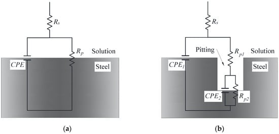 Electrochemical equivalent circuit for the corrosion system: (a) without sand, (b) with 2 wt% sand.