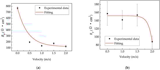 Values of Rp were obtained after fitting Figure 3. The curves shown in Figure 5a were plotted with different velocities as the abscissa axis and values of Rp as the vertical axis. It shows that when the fluid velocity increased from 0 to 0.5 m/s, the Rp was associated with a profound decrease. When the flow velocity continually increased from 0.5 m/s to 2 m/s, the Rp decreased overall but at a smaller rate. The value of Rp has an inverse relation to the corrosion rate: a higher Rp is associated with a low corrosion rate. Thus, it can be determined from Figure 5a that with the growth of velocity, the corrosion rate was in a tendency of going up on the whole, but the increase rate became smaller as the velocity increased.