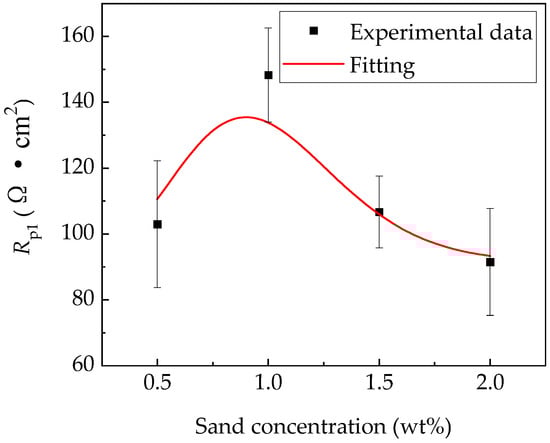 It can be seen from Figure 6 that a mono capacitive loop appeared on the diagram when the mass fraction of sand was lower than 2%, which indicates that a lower concentration of sand cannot speed up corrosive pitting. Thus, Figure 4a was used to fit the EIS diagram measured on 2# steel in oil-water flow with smaller sand concentrations while Figure 4b was used to fit the EIS diagram on 2# steel in oil-water flow with 2 wt% sand. Fitting results, as shown in Figure 7, show that with the increasing concentration of sand, polarization resistance went up before going down, while the corrosion rate went down before going up. This result is due to the smaller scouring action of the sand on the electrode surface, and this action of sand can help remove the corrosion product on the surface to speed up the formation of passive film. Thus, the corrosion rate can be slowed down; with the concentration going higher, starting at a concentration of 1 wt%, the more frequent scouring action of sand will destroy the corrosion product and passive film, so the corrosion is accelerated [33].