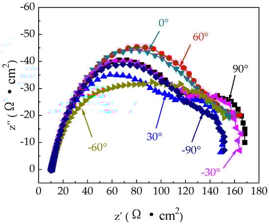 EIS test results at different angle positions of a pipe section are shown in Figure 8. This figure shows that double capacitive loops appeared at all angle positions and all capacitive loops are basically the same, with minor differences in size. Thus, the corrosion mechanism at different positions is basically identical. Moreover, taking the unavoidable testing errors into consideration, corrosion behavior at different positions of a pipe section is nearly the same. While it was believed that the non-uniform distribution of flow velocity and particle concentration [22] in a tube is responsible for the different erosion-corrosion behavior at different locations, it could be concluded that there was only a minor difference in the flow velocity and particle concentration in the pipe flow.