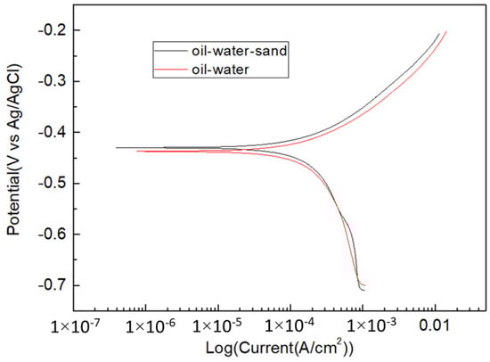 where Rpoil-water is the polarization resistance of 20# steel in the oil-water system and Rpoil-water-sand is the polarization resistance of 20# steel in the oil-water-sand system, both were obtained after the fitting of EIS. Boil-water and Boil-water-sand are the Stern-Geary coefficients of 20# steel in the oil-water system and the oil-water-sand system, respectively. Tafel curves of working electrodes, as shown in Figure 9, were measured in the oil-water system and the oil-water-sand system at the velocity of 2 m/s to obtain the two Stern-Geary coefficients. Fittings of βa and βc were done and substituted in Equation (10) to work out the value of B, as follows: