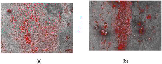 After the corrosion product was removed through chemical cleaning, the electrode surface was observed through an SEM again, and the morphology after cleaning in two tests is shown in Figure 10 and Figure 11. A comparison of the two figures indicates that corrosion pits were formed on the surface in two tests: the number of corrosion pits was larger in the pure corrosion test, while the number of pits was smaller in the erosion-corrosion test. This is further illustrated by the ratio of pit area to the whole area obtained with ImageJ, as shown in Figure 12. The ratio of pit area to the whole area for the pure corrosion test electrode was determined to be 10.33%, while it was 8.43% for the erosion-corrosion electrode. At the same time, the corrosion pits on the pure electrode were more evenly distributed, compared with that of the erosion-corrosion electrode. Thus, adding solid particles makes the corrosion pits more concentrated.