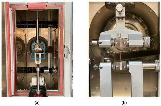 For the fatigue testing, a 40 mm long wire sample was directly fixed by the clamping jaws of the electrodynamic testing machine LTM 1 HR from Zwick Roell (Ulm, Germany). To protect the wires from air draft or significant temperature fluctuations, the measuring setup is operated in the switched-off furnace of the LTM 1 HR. Figure 1 shows the measurement setup in the furnace (Figure 1a) including a detailed picture of a fixed wire in the clamping jaws of the machine (Figure 1b). When fixing the wire sample in the clamping jaws, care must be taken to ensure that the wires were as straight as possible without deforming and straightening the wire and that they were correctly fixed in the clamping jaws without being able to slip.