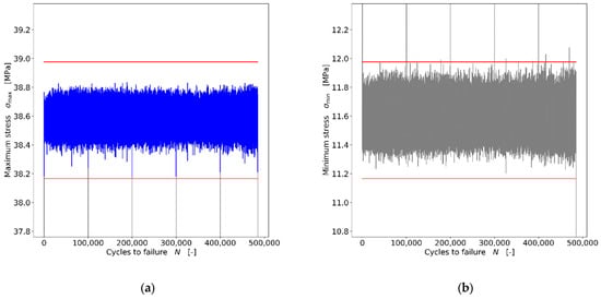 History of maximum stress values (a) and minimum stress values (b) up to fracture in the ±3% range (red lines) for Al-Pure Sample 71, R = 0.3, σa = 13.5 MPa, σmax = 38.57 MPa, σmin = 11.6 MPa, N = 485,139.
