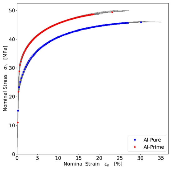 The nominal stress-strain curves of Al-Pure (blue) and Al-Prime (red) determined by tensile tests are shown in Figure 3. It can be observed that the results of all ten individual measurements (grey) for both wire types have a very low scatter and therefore a very good reproducibility.