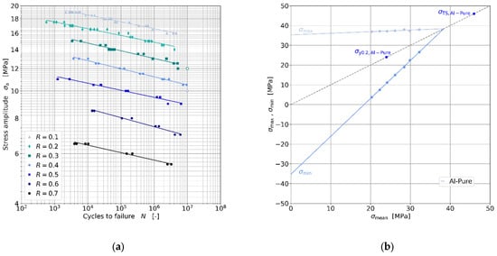 Wöhler diagram of Al-Pure at 40 Hz with R-ratios between 0.1 and 0.7 (a), Smith diagram of Al-Pure at 1,000,000 cycles with R-ratios between 0.1 and 0.7 (b).